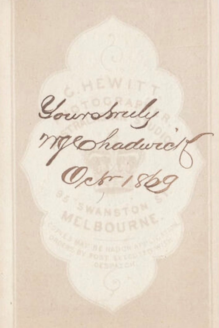 The carte-de-visite of Chadwick, featured in formal attire with top hat and cane at the ready – was captured in the Swanston Street Australasian Studio of the photographer Charles Hewitt in October 1869. Credit for the discovery goes to Pete McLean, who for the past 18 years has voluntarily researched the club’s pre-VFL history for the much-patronised Blueseum website.